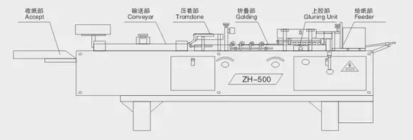 ZH-500 mini automatic folder gluer is the company’s latest economic and flexible type of small folder gluer; the aircraft are small but fully functional, with automatic feeder, automatic gluing, automatic folding, automatic counting, and other functions. It is the required equipment for small and medium-sized printing factories. For normal boxes, the speed is about 30000 pieces per hour.