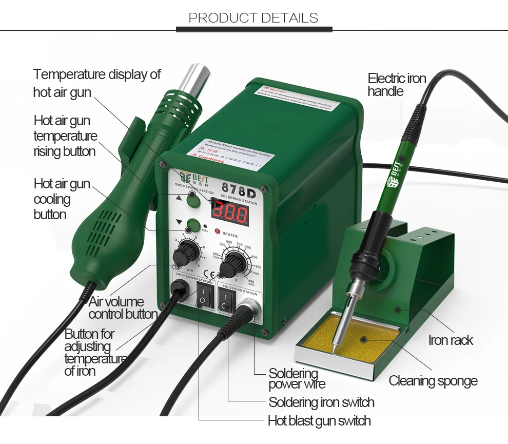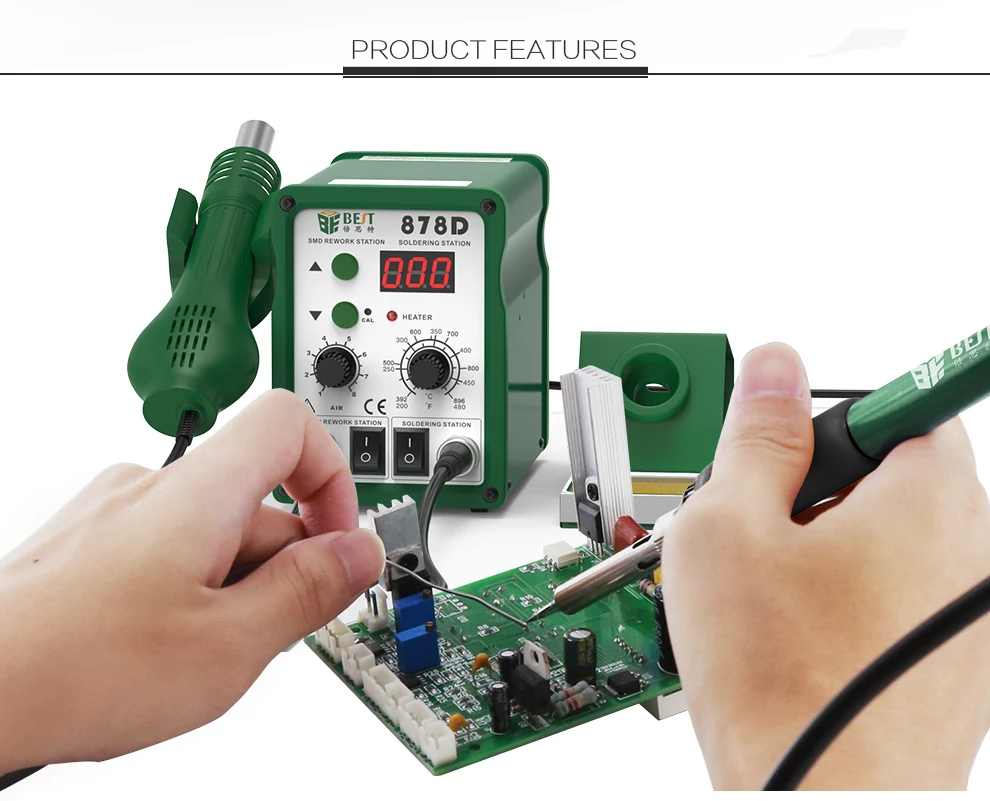 ESD safe by design,Hot air station,soldering station ,LED digital display,can autocephaly use,noninterference each other.PID controlled closed loop of sensor, rapid heating ,precise and stable temperature,Suitable for soldering and de-soldering surface mountd ICS,Such as QFP,PLCC,SOP,BGA etc.Light handle ,Especially suitable for mounting and reworking SMD components by hand,repair,soldering common and directly-inserted electronics and soldering under other special conditions,Hot air station intelligent cooling system,Deferred air delivery after switch off upon completion of rework and automaically switch off power supply when temperature is below 50C.Use imported heating wire of long service life.