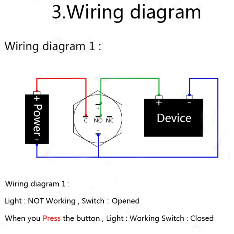 there are 5 terminals : ' + ' and ' - ' are for lamp ... C , NO , NC is for switch