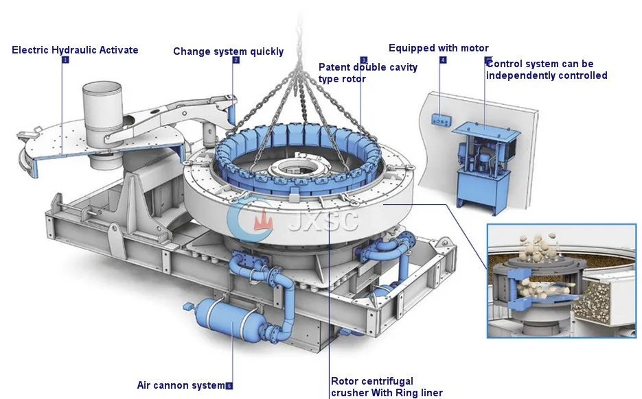 Material from the upper vertical machine fall into a high-speed rotating impeller, with the high speed centrifugal force, material impact and crush with the other part of umbrella shaped material distributed near the impeller. After hitting each other, material will form an eddy between the impeller and casing, and repeatedly hit ,friction and shattered each other. Material discharged vertically from the bottom, screening out the required finished product granularity by screening equipment.