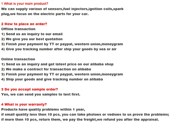| Relevant Products | Spark plug,nozzle injector,ignition coil,oxygen sensor,clock sprning,Sensors,Valve,Bearing,filter,fuel pumps etc. |
