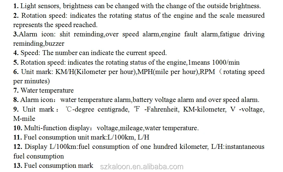 Function: One hundred kilometers per hour speed instantaneous fuel consumption instantaneous fuel consumption, temperature voltage speed alarm, water temperature alarm, voltage alarm, fatigue driving reminders shift reminder that this kms, detect fault codes eliminate the fault code