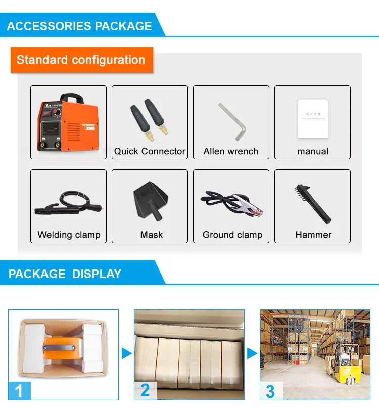 | Accessories | Electrode holder 2meter and earth clamp 2meter,face mask and welding brush |