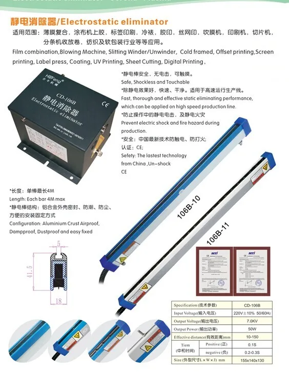 2.Fast, thorough and effective static eliminating performance which can be applied on high speed production line.