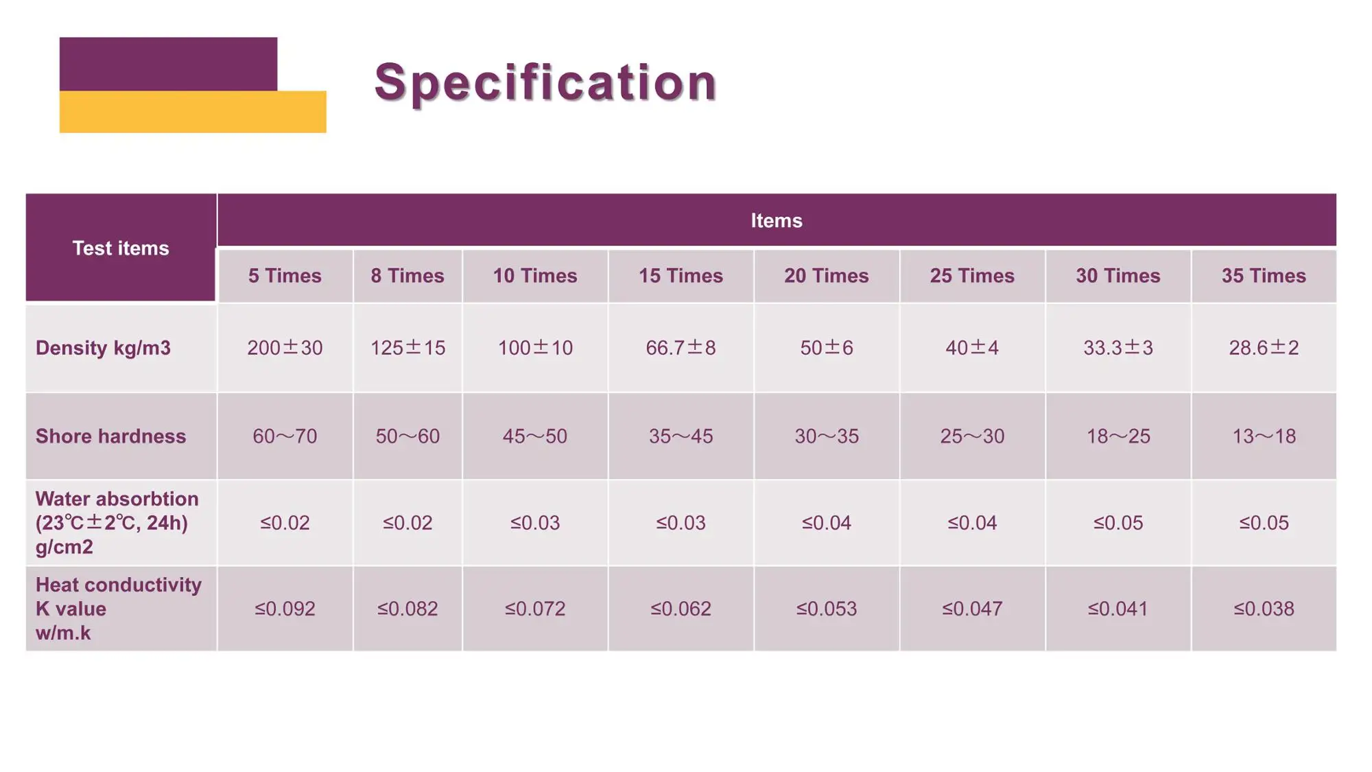 Heat conductivity K value w/m.k | ≤0.092 | ≤0.082 | ≤0.072 | ≤0.062 | ≤0.053 | ≤0.047 | ≤0.041 | ≤0.038 |
