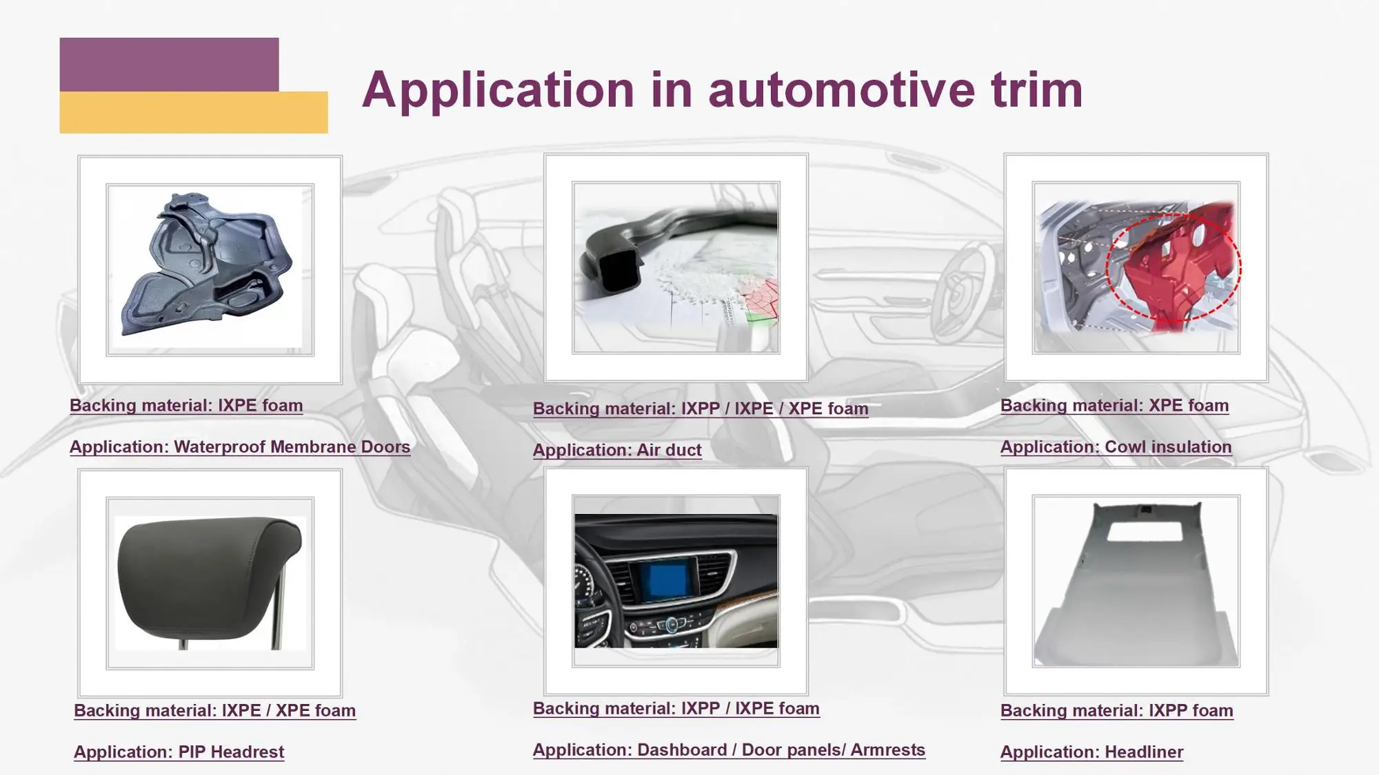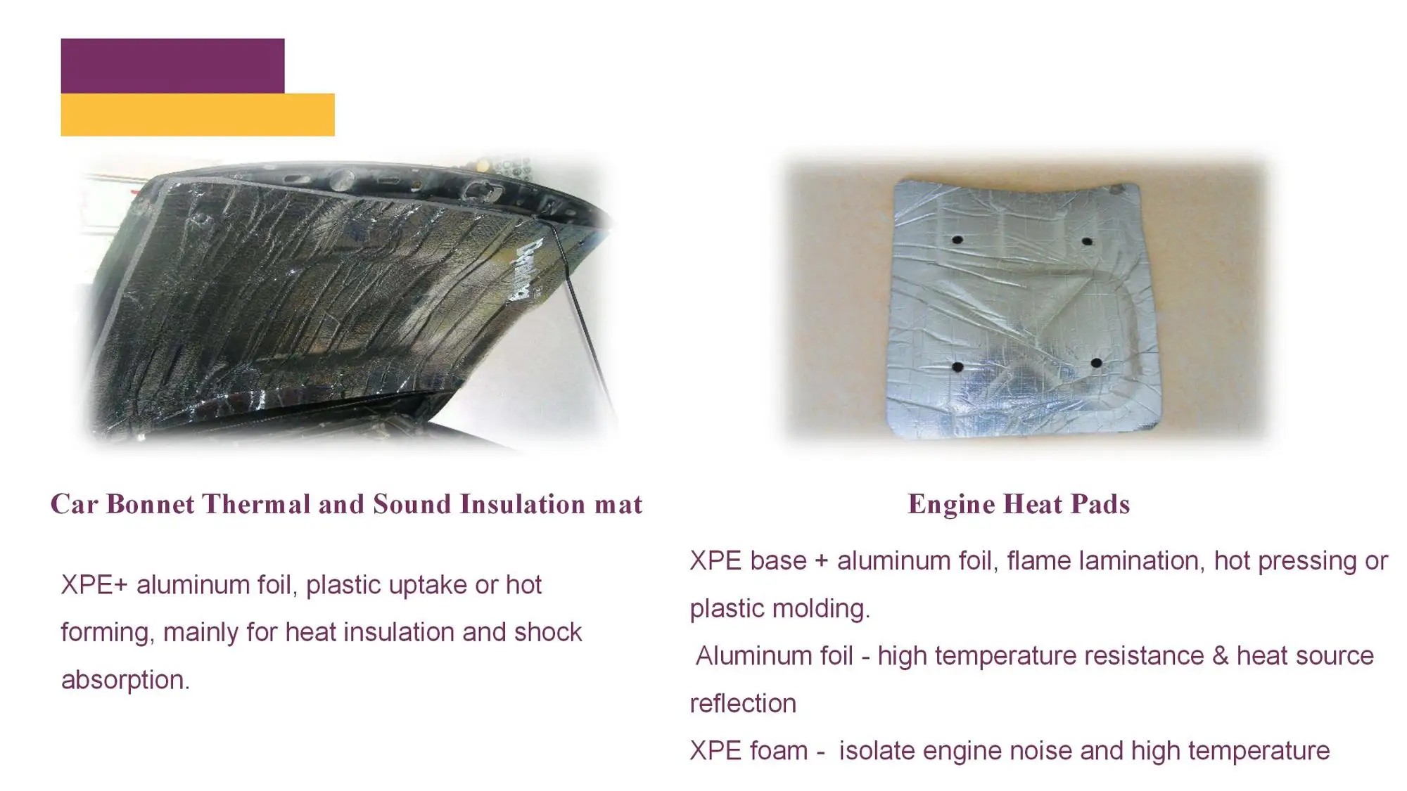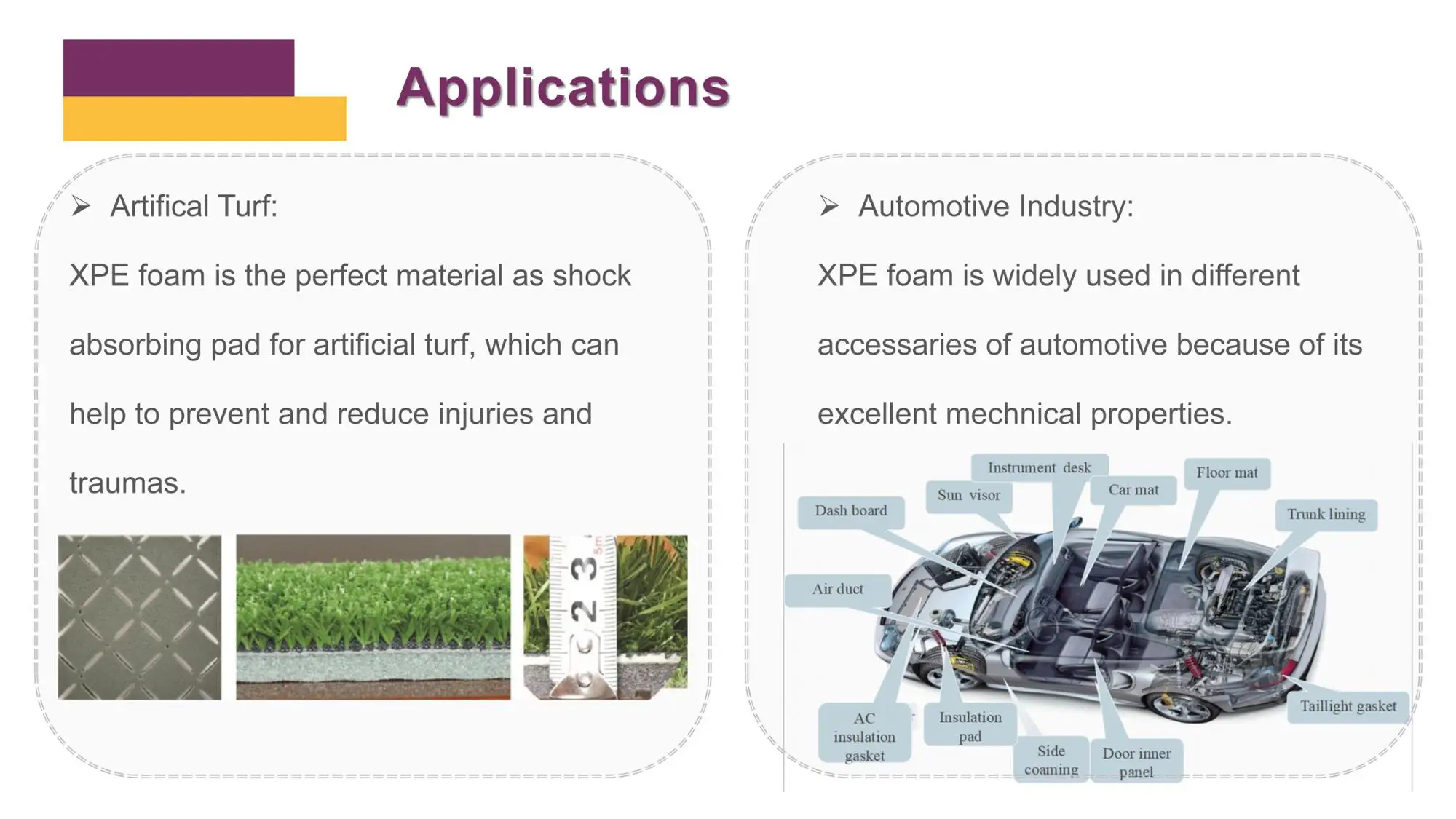 Based on its favorable high mechanics intensity, XPE is suitable for sports protective gear, handbags, automobiles, aerospace, constructions, shoe materials, air conditioning, pipeline insulation and so on.
