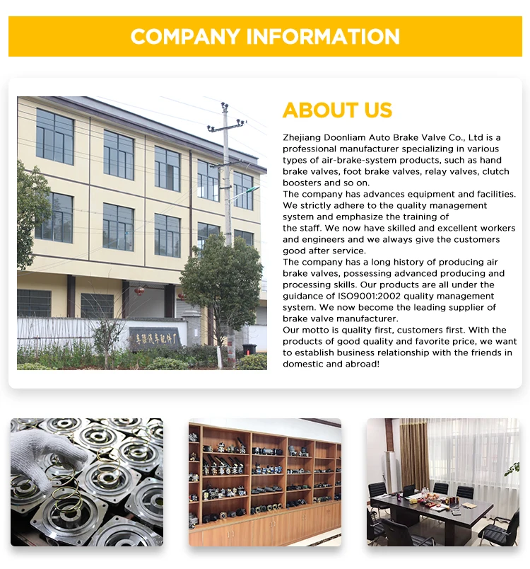 Thank you for visiting our website. We strive to provide the best service for all customers with the best products. We produce brake pump, clutch booster, manual valve, air dryer, relay valve, trailer valve and so on more than ten years. In order to better exploit overseas market, we set up our own import and export company. Please feel free to contact us. We provide 7 x24 hours of service. If we don't reply to your mail, please send it to us. Thank you for your support, I wish you have a nice day! greetings.