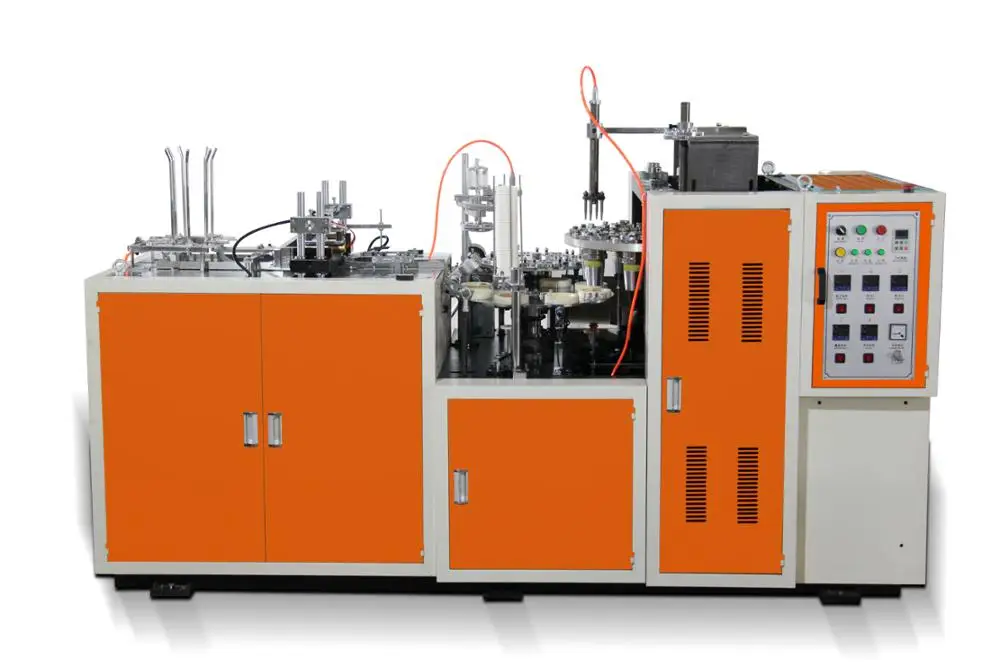 This machine runs a whole procedure of paper-feeding, cup-fan-wall sealing, oiling, and bottom punching, heating, rolling, rimming, rounding and tripping.