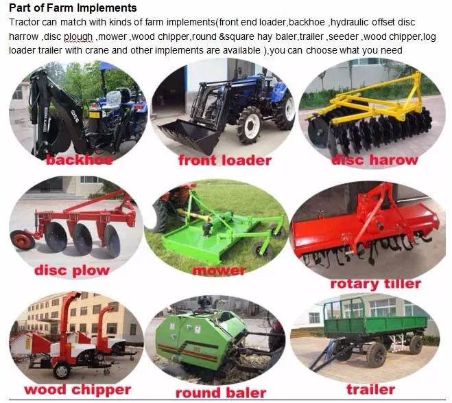 Reply: All kinds of tractors and farm implements, including front end loader, backhoe, trailer, disc harrow, hydraulic reverible plough, disc plough, round baler, seeder, mower, rotary tiller, snow blower.