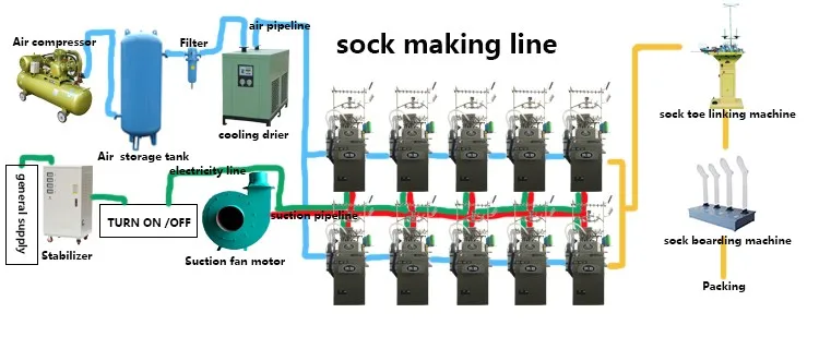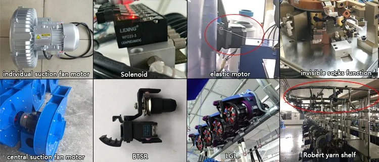It is an equipment which is used to suck the finished socks up from socks machine. There are two kinds can be choosen: 1) Individual suction fan motor: if the quantity of socks machine is 1, 2, 3 or 4 sets, this motor will be suitable because it is installed inside of machine which can save the space; 2) Central suction fan motor: it is suitable for a large quantity of socks machine because one set motor can support 5sets, 10 sets, 20 sets even more socks machine working.