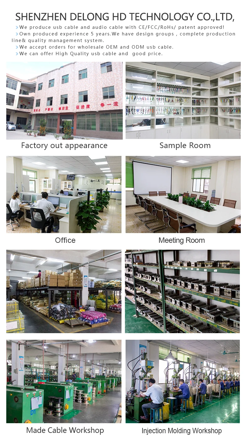 Shenzhen Delong HD Technology Co., Ltd., located in Building A, Tongfeng Industrial Park, No. 29, Longwan Market Road, Longtian Village, Hangzi Town, Pingshan New District, Shenzhen City, Guangdong Province, China. The company covers an area of 2500m2 and employs 200 people. Our factory mainly Production and processing of mobile phone charging data cable, 3.5AUX audio cable, HUB converter, OTG data cable, data cable plug metal shell and so on.
