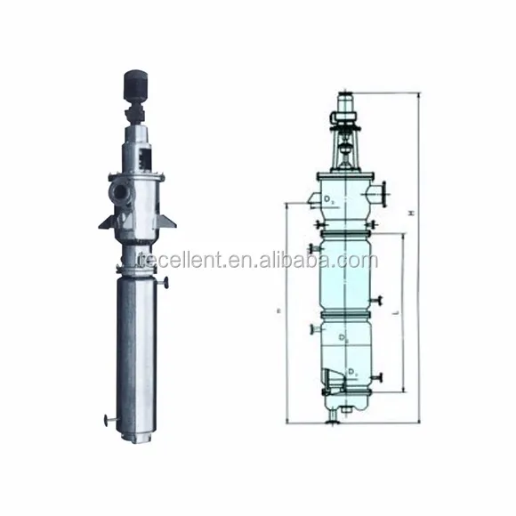 The wiped thin film evaporator is composed of a revolving shaft, scraper blades, bearing, evaporating chamber and heating jacket. There are two types: horizontal type and vertical type.
