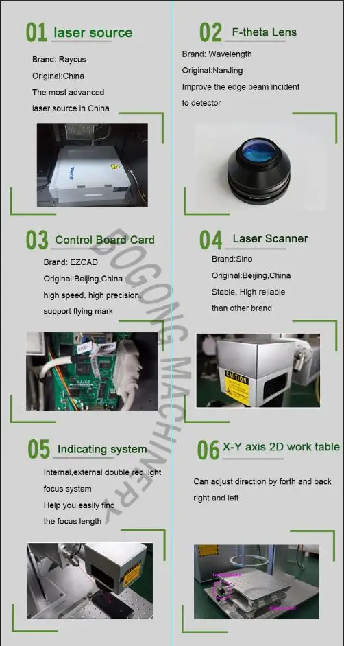 BOGONG laser marking machine adopts the best quality fiber laser source in the world. We have 10w, 20w, 30w and 50w for optional. The estimated life for laser source will be around 100,000hours, which is 10 times longer life than diode laser and 2 times longer life than other fiber laser source.