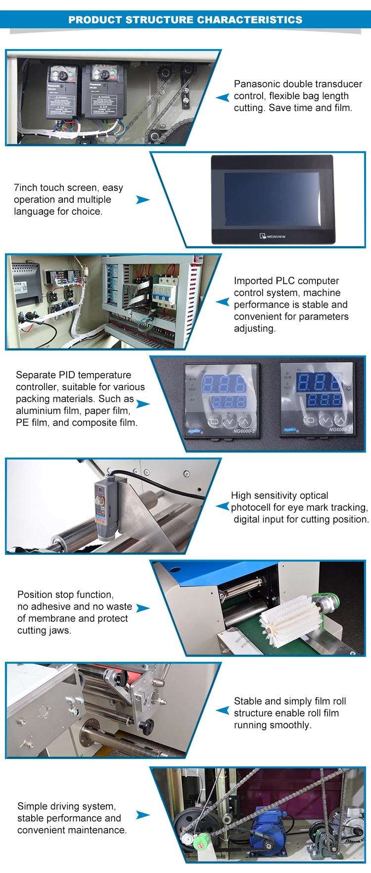 1. Panasonic double transducer control, flexible bag length cutting. Save time and film.