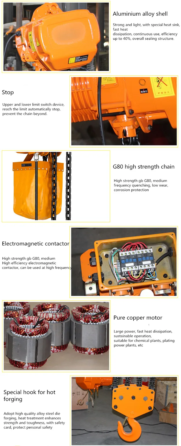 Electric chain hoist consists of the motor, transmission and sprocket composition.