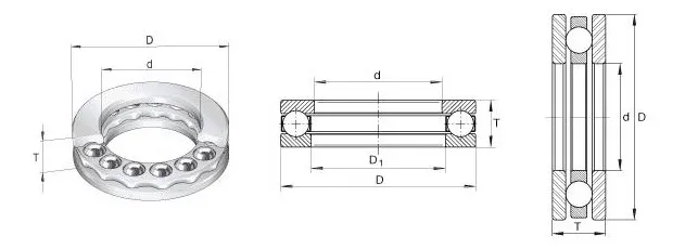 thrust ball bearing consist of three parts, a shaft and housing washer that have annular grooves in them and a caged ball bearing assembly that is sandwiched in between them. Assembly and mounting is a simple operation as the parts are separate. They support axial loads in one direction. Clearance is provided in the bore of one of the raceways to allow for alignment.