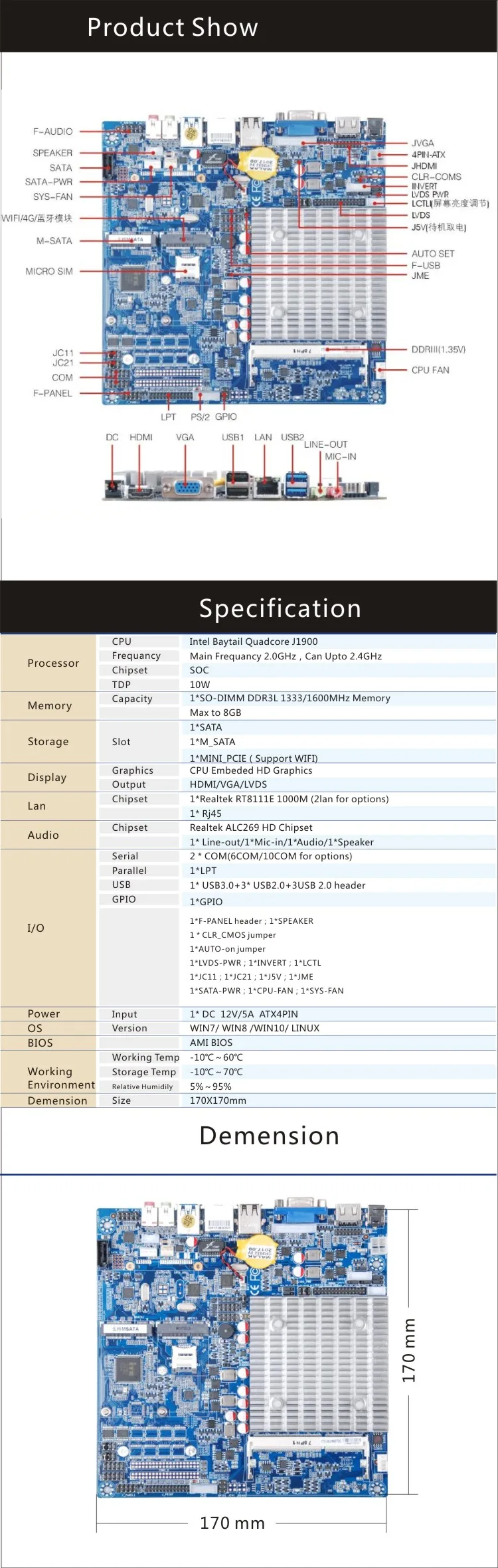 | OS: | Linux/ Win7/Win8/Win10; | USB: | 3*USB 2.0 Header 1*USB3.0 3USB 2.0; |
