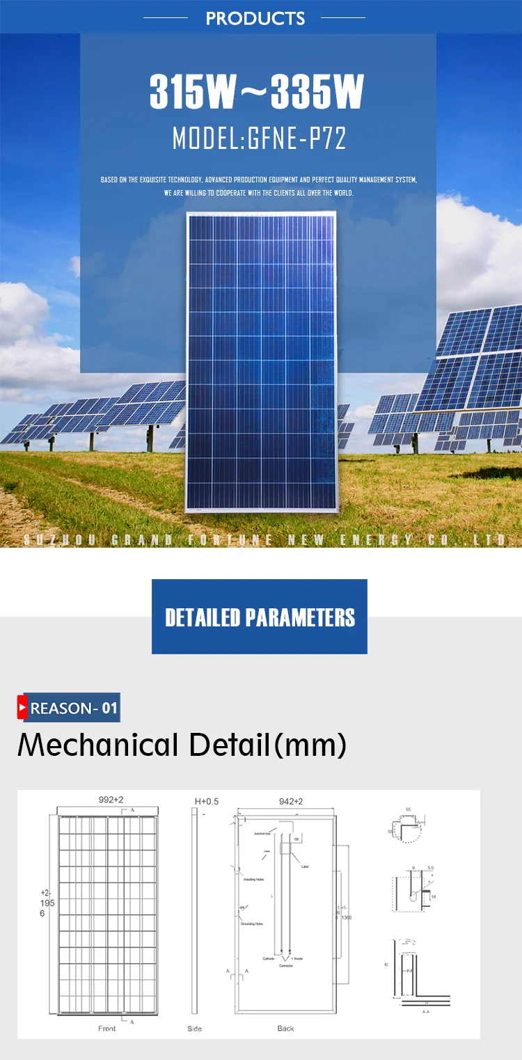| Product name: | High Efficiency 315W 320W 325W 330W 335W Polycrystalline Solar Panel; | Delivery Detail: | 15days-20days after payment; |