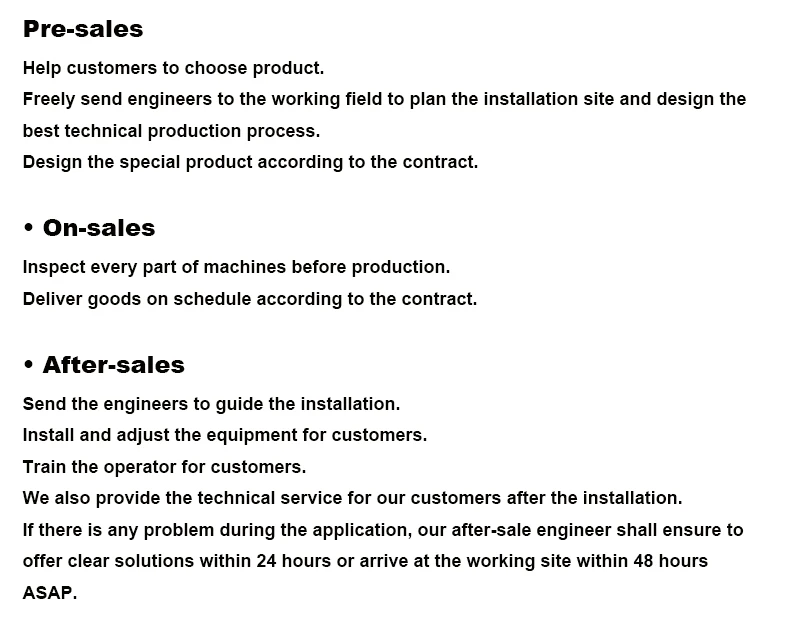 | After-sales Service Provided: | Video technical support,Free spare parts,Online support,Field installation, commissioning and training,Field maintenance and repair service,No after-sales service; | Spare parts supply: | Long Term; |