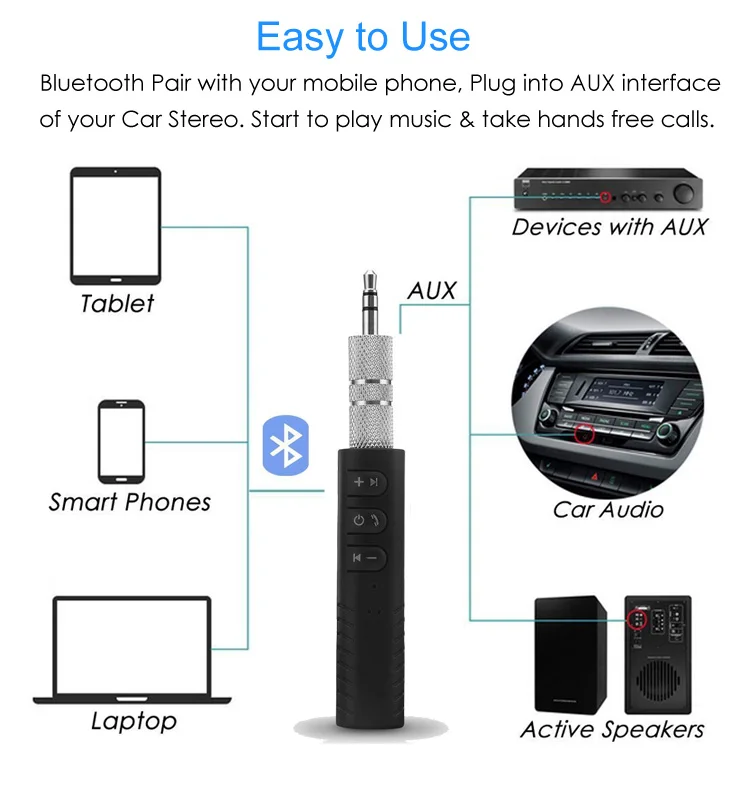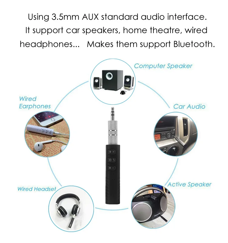 | Use: | for car stereo audio system/wired headphone/home theatre stereo system; | Product name: | Bluetooth Car Kit, AUX Bluetooth Audio Adapter; |