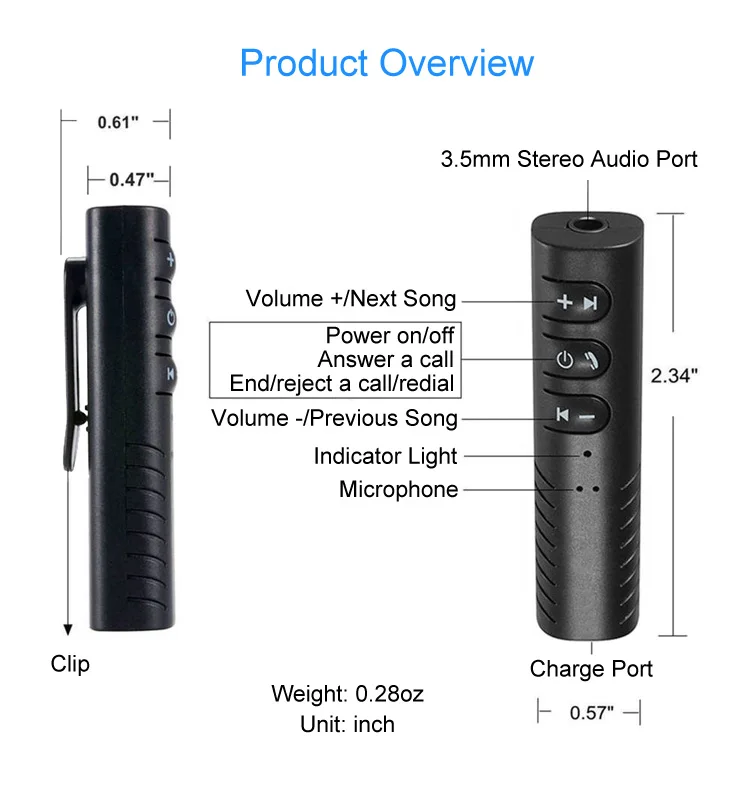 | Port: | Shenzhen, Ningbo, Shanghai, Hongkong, HK, Dalian, Qingdao, Hangzhou, Guangdong, Guangzhou, Zhuhai, Dongguan, Yantian, Shekou; | Product type: | 3.5mm Car Bluetooth Receiver for Music Streaming & Handsfree Calling; |
