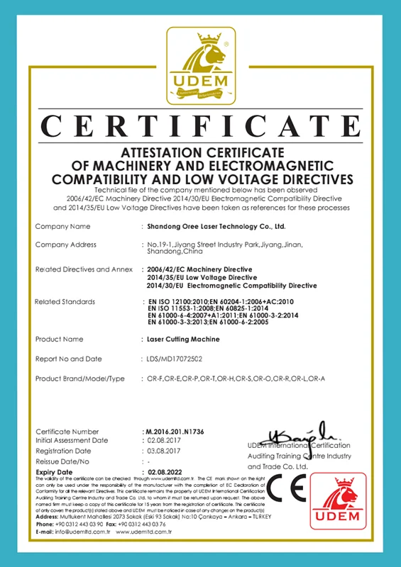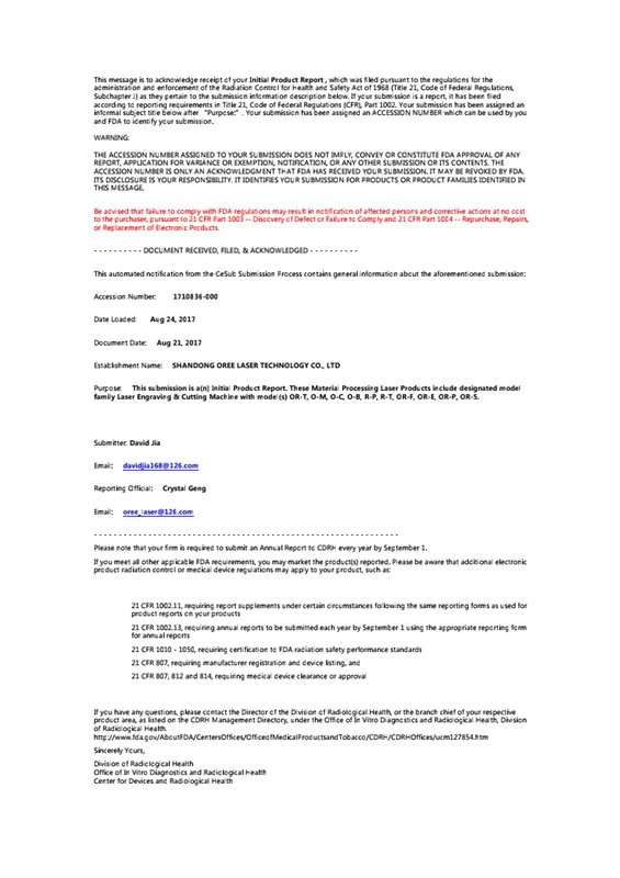 Each product from Oree Laser is strictly examined according to ISO9001 (QCS) standard before it is put on to the market. Many laser equipment series have acquired CE,FDA certificate.