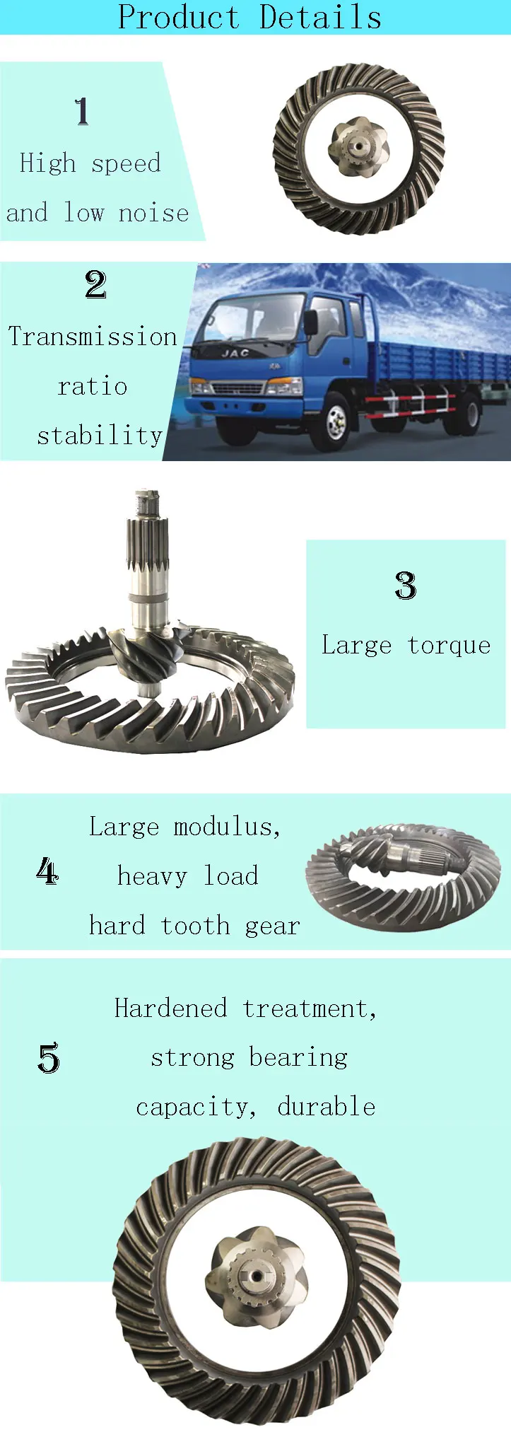 After 38 years of development, there are now about 700 employees and 658 sets of equipments in our new plant, with total assets of 780 million, total area of 191,359 square meters, monthly providing a maximum output of 45,500 sets of crown wheel pinion, 27,300 sets of differential assembly, and respectively 36,400 sets of front and rear axle assembly.
