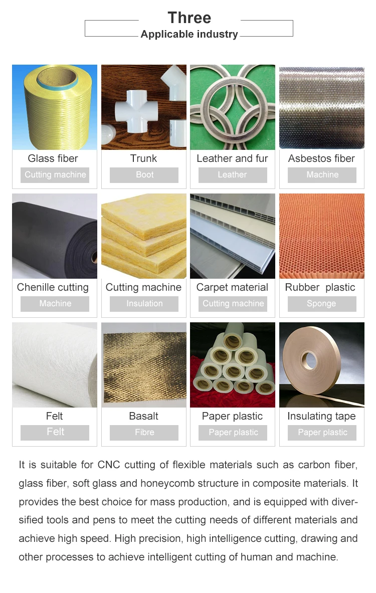 Applicable materials | Glass fiber, glass fiber cotton, prepreg, carbon fiber, carbon fiber felt, boron fiber, aramid fiber, ceramic fiber, soft glass, PVC, leather leather, sponge composite skin, XPE material, wire ring, leather, soft glass , silicone, rubber material etc composite soft material | |||||