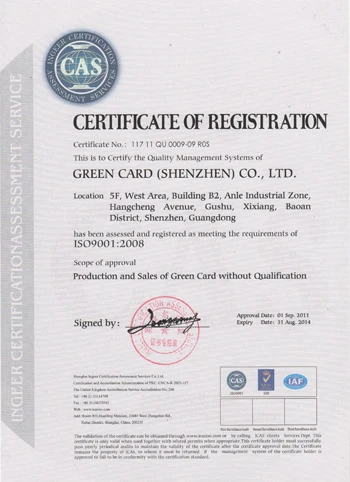 Green Card (Shenzhen) Co.,Ltd. is located at 5/F, West, B2 Building, Anle Industrial District, Hangcheng Road, Bao'an, Shenzhen, China. We are professionally engaged in the production of smart cards, IC card systems and IC card readers. Our company's products include contact IC cards, contactless IC cards, paper cards, composite cards, portrait cards, phone cards, barcode cards, magnetic stripe cards, VIP cards and other material cards, as well as contact IC card readers, contactless IC card readers and card printers.