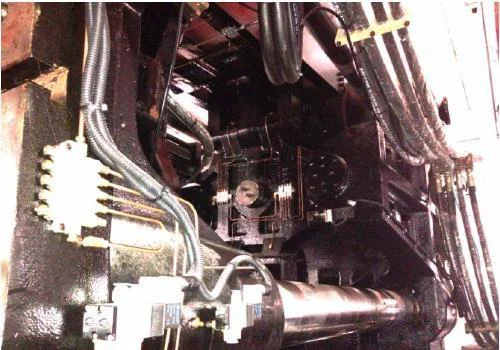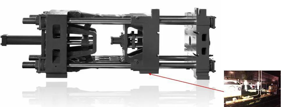 800T and above machine, the moveable platen support feet adopt hydraulic support device, ensure perfect mold open and close stability, and extend mold using life.