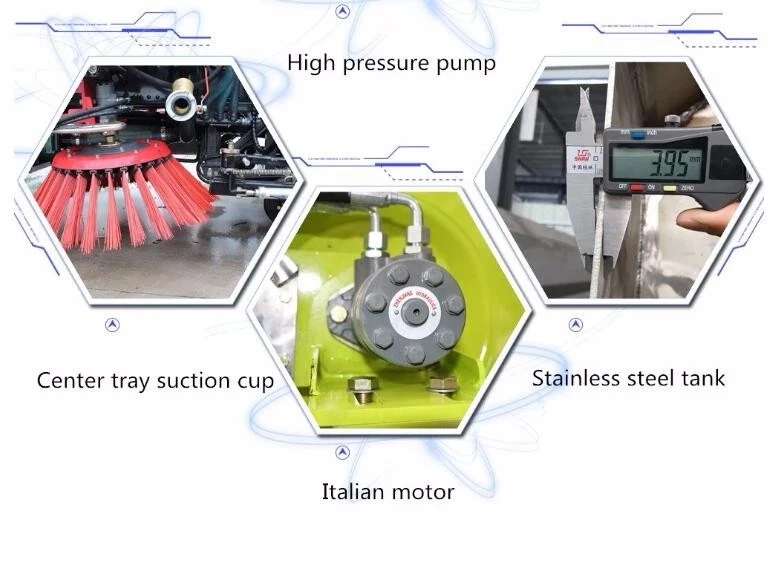 | Equiped with four sweep plate combined with the sucking mouth . Equiped with stainless steel rubbish tank ,clean water tank and dirty water tank | ||