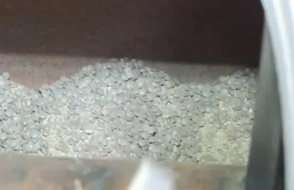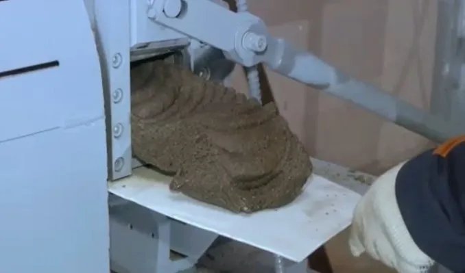 All of the components (polymer, sand, dye) are loaded into the extruder hopper. The shut-off device must be closed during the loading of the components. The components are going through the extruder body (rack) are mixing and heating until it gets a certain temperature (the temperature depends on the type of polymer used).