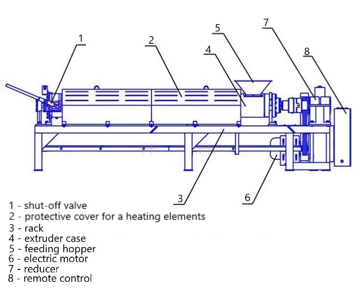 The extruder consists of electric motor, reducer, feeding hopper, protective cover for a heating elements, shut-off valve that are mounted on the rack and remote control. The rotation from the motor is transmitted through the V-belt drive and the reduction gear to the screw.