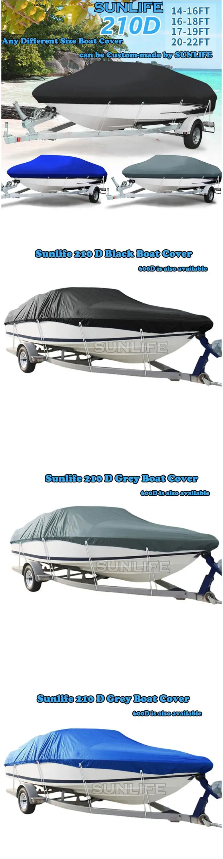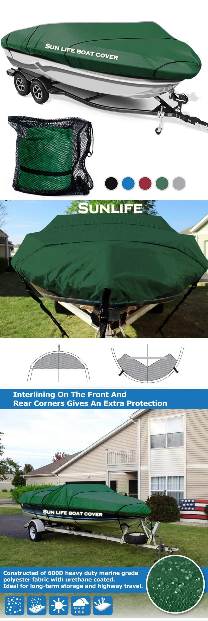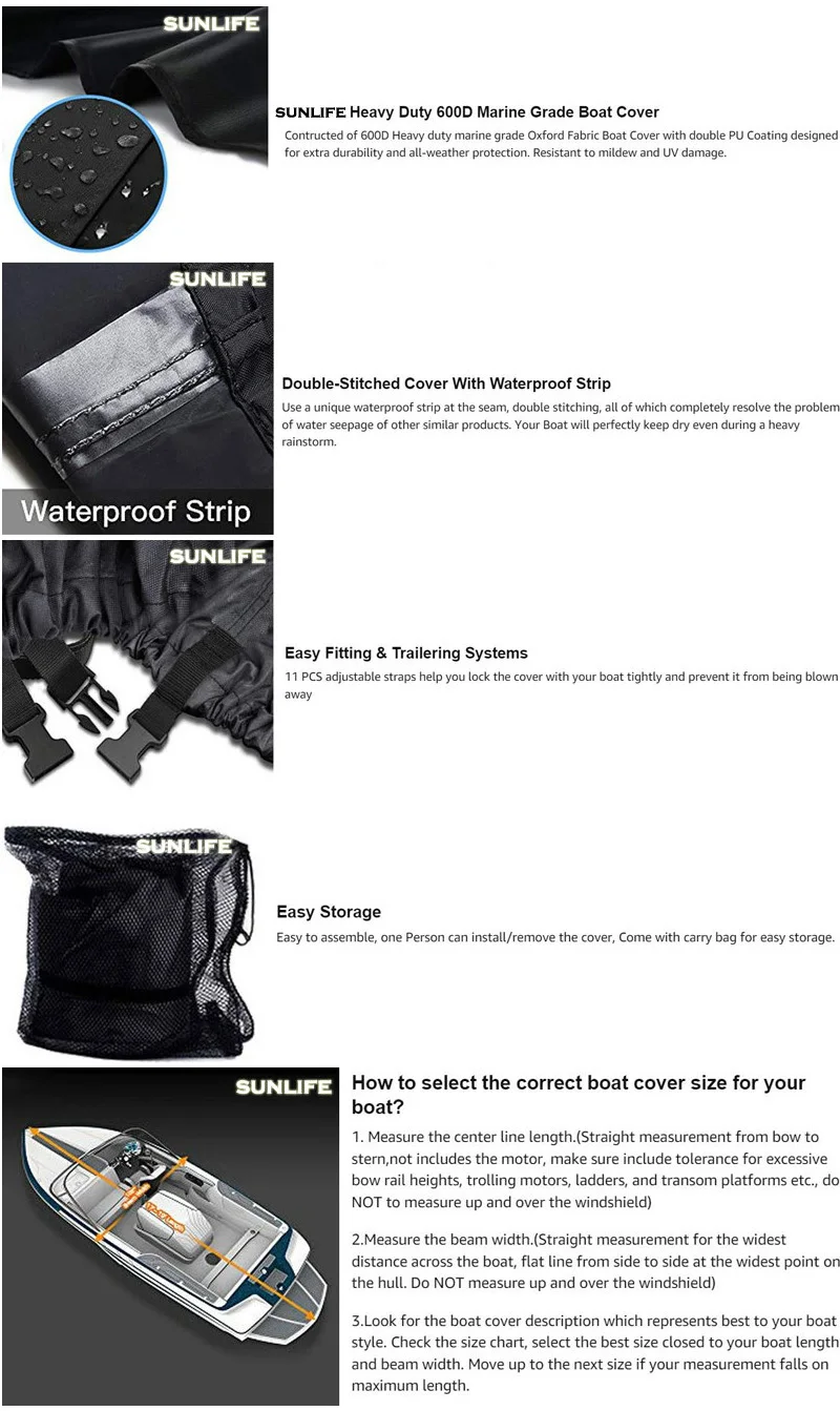 SUPER WATERPROOF PERFORMANCE: Owing to the superior 600x600D oxford and our special textile process, Sunlife boat cover can withstand up to 2000 Pa water pressure ( Most competitors only 700-800 Pa). In addition, the inner layer also adds the double waterproof PU Coating and the seams come with the waterproof strip, all of which completely resolve the issue of water seepage of other similar products. Your boat will perfectly keep dry even during a