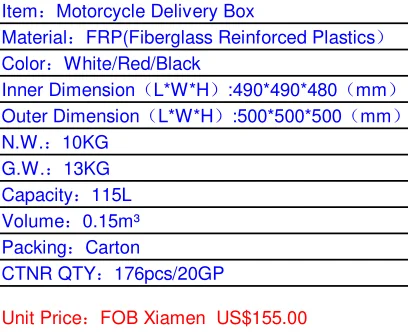 A: Our company specialized in manufacturing FRP delivery box for motorcycle,scooter and electric bicycle,having more than 10 years manufacturing experience.