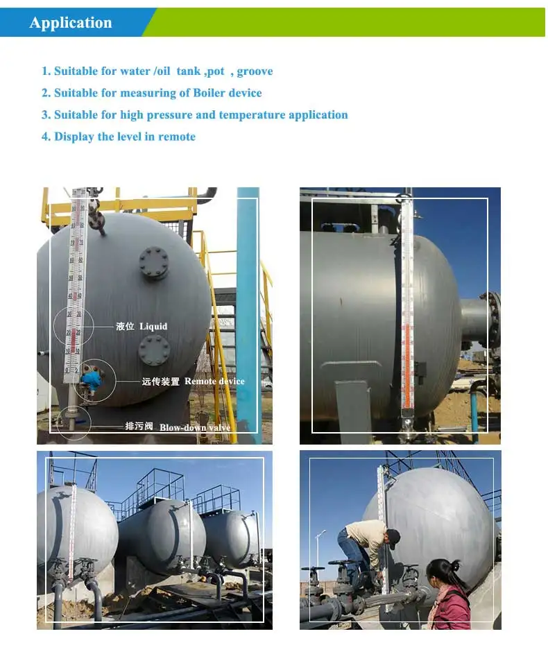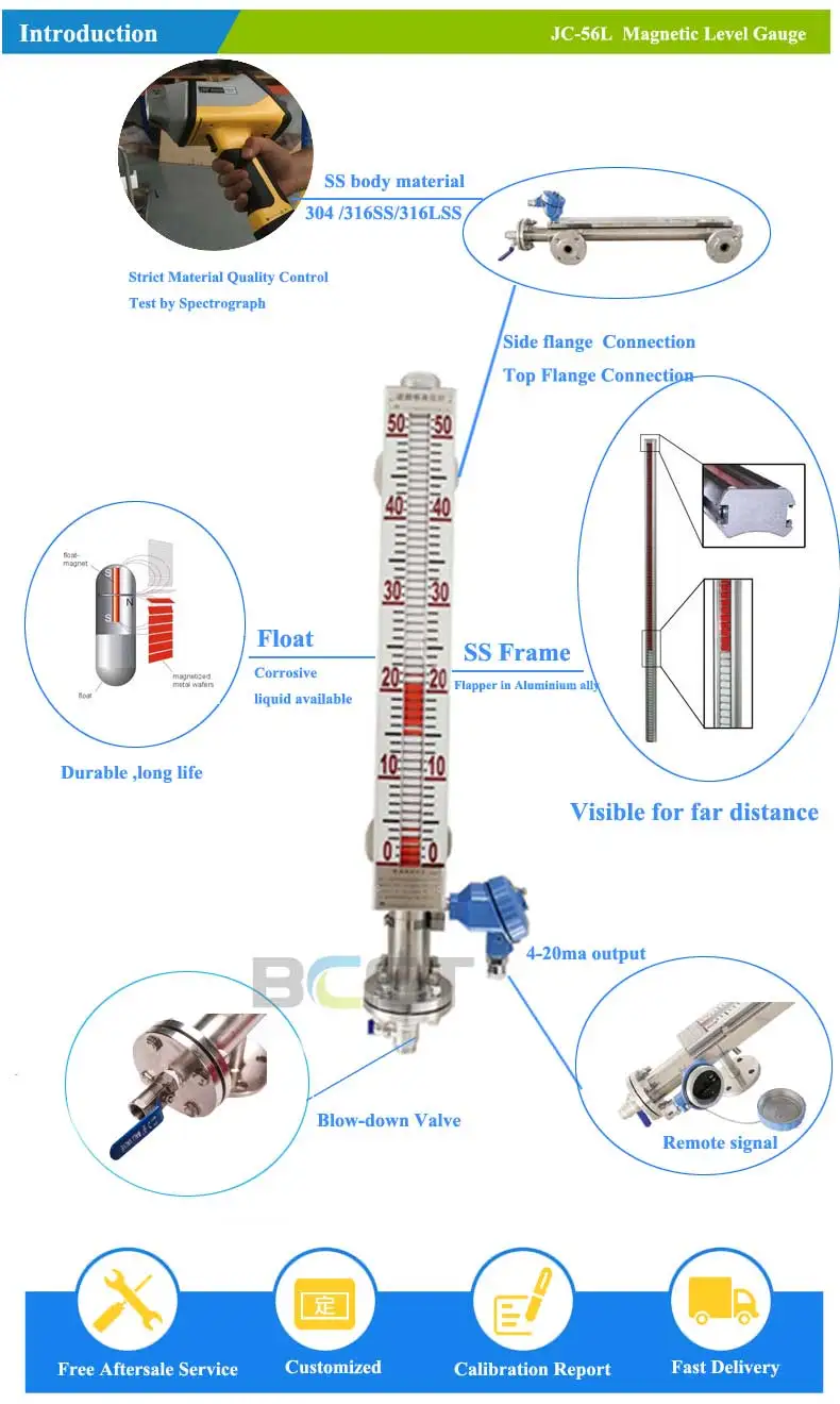 The magnetic level gauge, JC-56L, operates on the principle of magnetic field connected to the vessel to