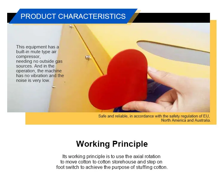 - Its working principle is to use the axial rotation to move cotton to cotton storehouse and step on foot switch to achieve the purpose of stuffing cotton.