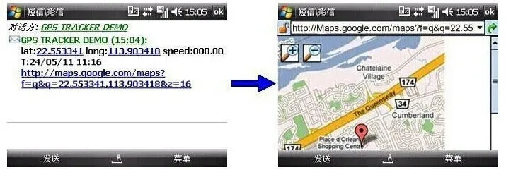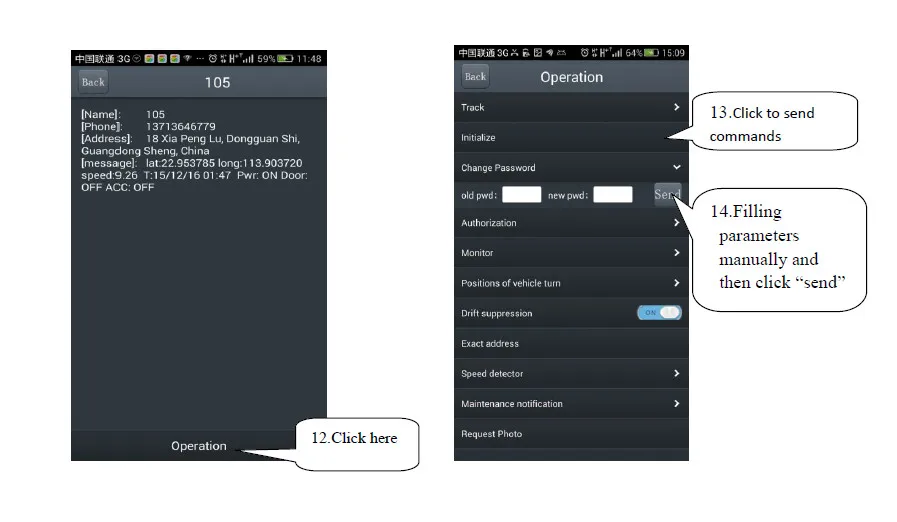 Remarks: APP on Android phone can track the address and show alarm by SMS;IOS APP can only send commands due to the confined policy