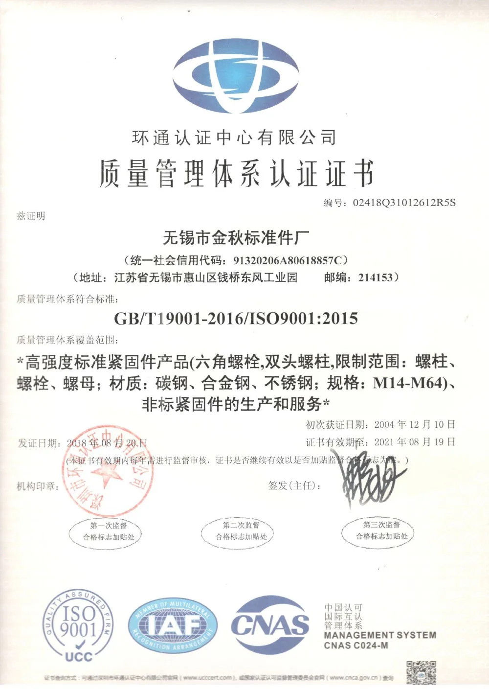 Founded in 1996, Wuxi JINQIU Standard Fasteners Factory specializes in manufacturing high-strength fasteners. Our company has been producing fasteners in Metric, British and American system in accordance with such various standards as China's national standard, industry standard, ASME/ANSI standard and Deutsche Industrial Norm (DIN), etc. We are also designing and producing customized fasteners to satisfy our clients' individual needs.