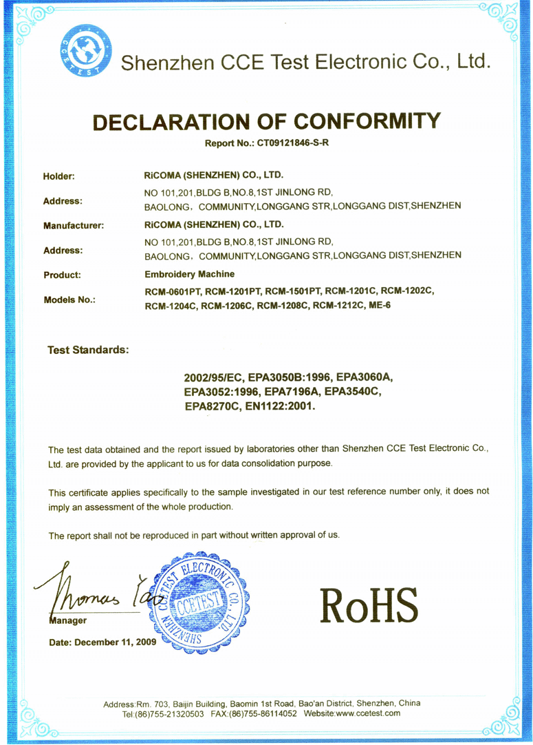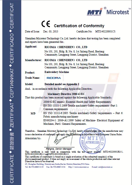 RiCOMA International Corporation, headquartered in Miami, FL and with our own factory located in China, is a leading international manufacturer of efficient commercial embroidery machines. We utilize the highest quality parts and electronics, Japanese technology and German engineering as well as a very stringent quality control process. Backed by the industry's best warranty, supported and serviced by our factory trained personnel to assure complete satisfaction and with the help of a huge international network of facilities and distributors, the RiCOMA brand has a presence in every corner of the world. We pride ourselves in being able to offer the perfect solution for all your embroidery needs and the support to assure you continued and total satisfaction.