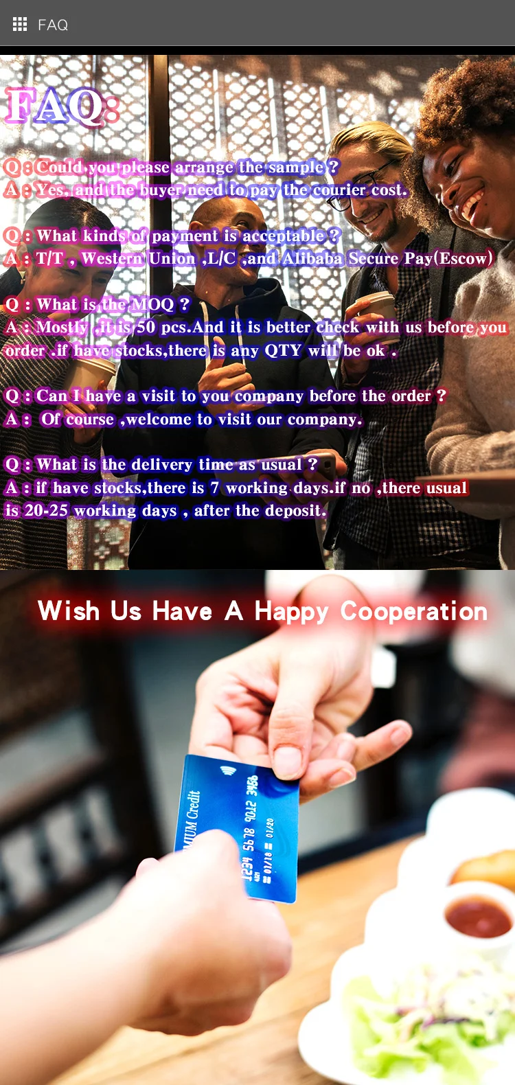 | Payment: | T/T; | Payment Terms: | L/C,T/T,Western Union,MoneyGram; |