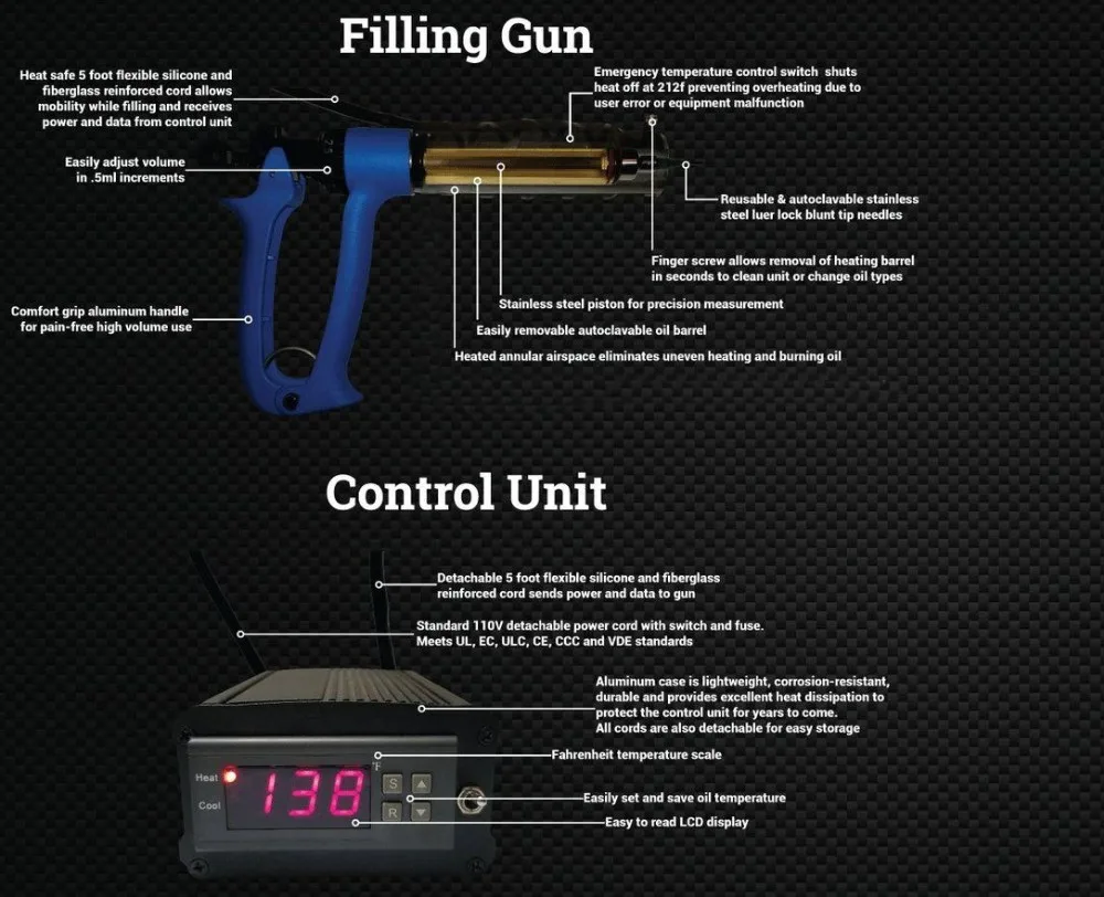 The filler advanced digital temperature control unit is built out of a durable and heat dissipating aluminum to give you years of trouble free use. The easy to program LED display allows you to set the exact temperature you want from room temperature to 194f. Data from the control unit is transmitted to the filler via a five foot flexible silicone cord that has been reinforced with fiberglass for strength. Both the power and data cords are detachable for easy storage.