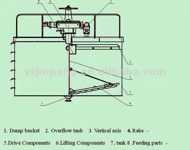 In the bottom center of a discharge concentration of the product discharge bucket, pond surrounding the upper ring with the overflow tank. Concentrated in the central pool has a vertical axis, the axis of the cross at the end of a fixed frame rake, rake the following aircraft equipped with a scraper. Rake into a horizontal plane and 8 ° -15 °. Fixed by the vertical axis in the truss on the motor reducer by the middle gear driven rotary. When the vertical axis rotation, the pulp along the truss to the mine shafts into the center of the bowl pool, and to concentrate around the pool flows. Pulp in the settlement of solid particles gradually condensed into the bottom of the pool by the following scraper plane rake scraping into the center of the pool discharge bucket with sand pump. To clarify the above clarificationwater from the Department of the Central Bank out of the overflow tank. In the thickener have been concentrated load or materials, the discharge will fight blockage and rake frame distortion. To prevent this phenomenon, there are signals of safety devices and equipment to upgrade rake frame.