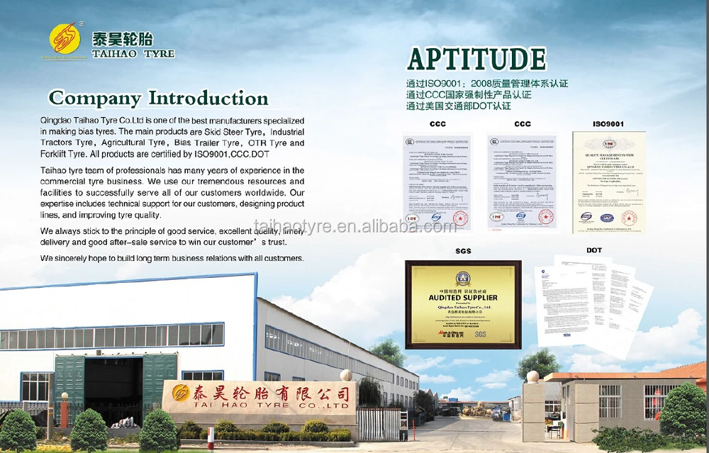 Agricultural Tyre,Skid Steer Tyre,Industrial Tractors Tyre ,Forklift Tyre,OTR Tyre,Trailer Tyre,Sand Tyre,Implement Tyre,Bias Light Truck Tyre ect.All products are certified by ISO9001,CCC,DOT