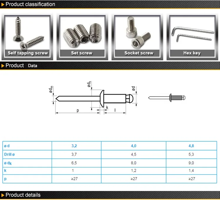 | Name: | Mushroom head break mandrel closed end blind rivets; | Package size per batch: | 15X15X10 cm; |