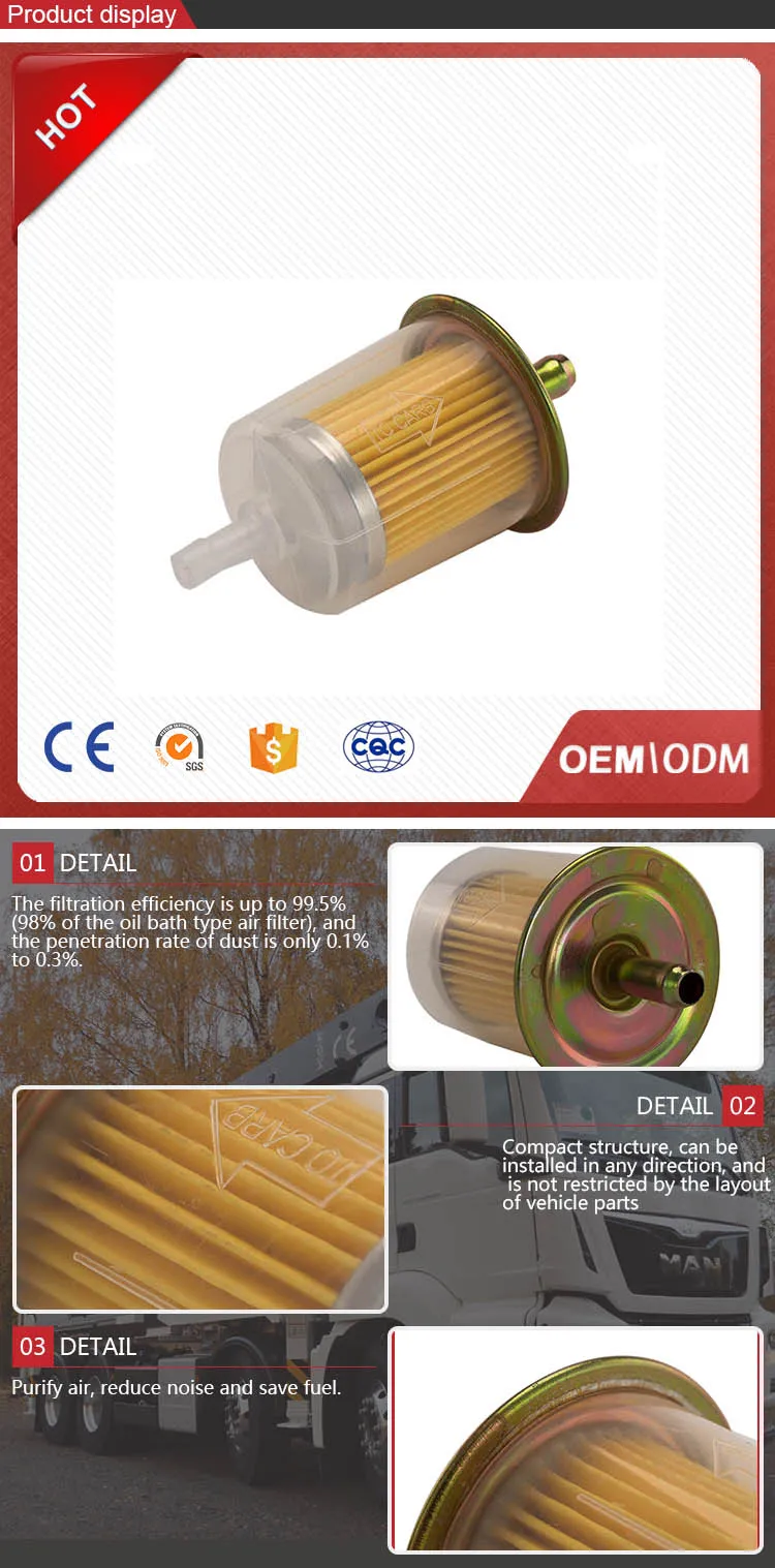 Descriptions: | 1.For removal of dust and other particles 2.Adopt high performance 100% wood pulp filter paper 3.100% mechanical rubber 4.Filtration efficiency over 99% 5.High standards from first grade materials specific to its application for European truck |