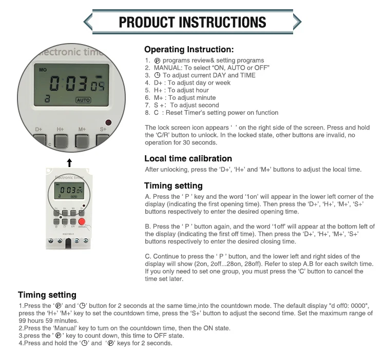 Easy to read LCD screen, panel mounted. Press D+ H+ M+ S+ Adjust the current time