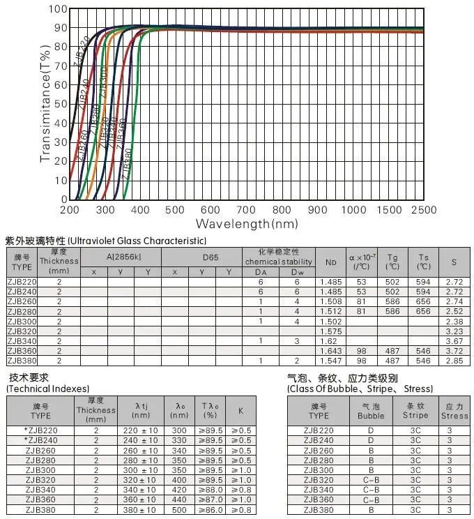 ZJB340,ZJB360,ZJB380, can absorb visible light. Mainly used for geological surveys,non-destructive detection, medical analysis equipment, UV transparent filter.