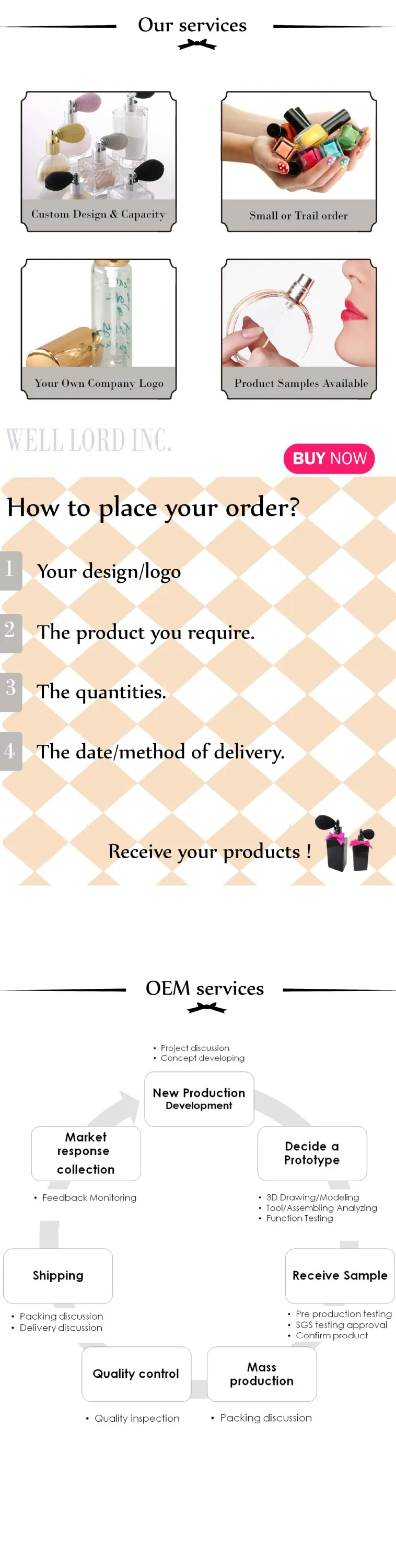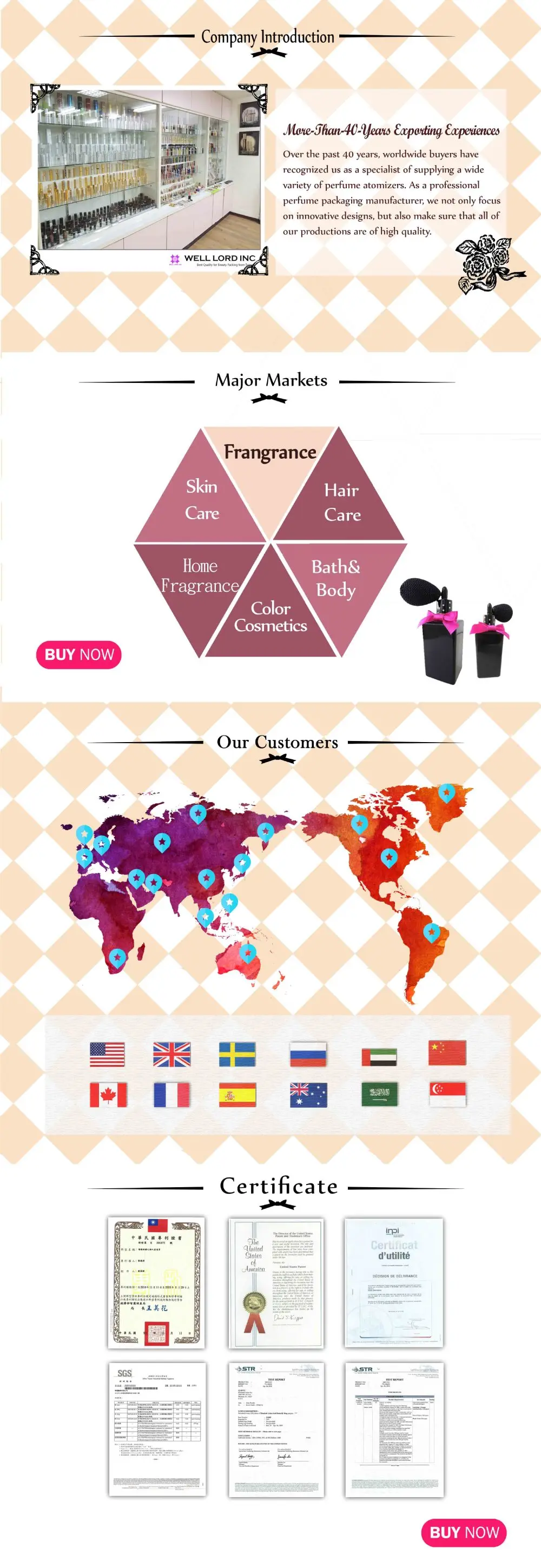 Well Lord Inc. is a professional Cosmetic and Perfume Packaging supplier, serving clients globally for almost 40 years since 1976. We constantly upgrade the designs, mechanisms and qualities of our products to keep up with every new technology. Our product line includes all kinds of Perfume Bottles, Bulb Atomizers, Beauty Products, Perfume Purse Atomizer, Crystal Perfume Atomizers, Fragrance Sprayers, Mini Perfume Atomizers, Serum Bottles, Perfume Dispenser Bottles, Perfume Pumps, Perfume Room Sprays, Perfume Travel Sets, Powder Spray Bottles, Refillable Fragrance Atomizers, Travel Perfume Dispensers, Glass Atomizer Bottles, Handbag Perfume Bottles, Portable Perfume Atomizers, Aluminum Perfume Bottles, Perfume Packaging, Antique Glass Perfume Bottle, Leak-proof Atomizers, Refillable Mist Sprayers, Leather-wrapped Purse Atomizers, Purse Atomizer with Jewelry Wear, Retractable Purse Atomizer, Dropper Bottles, Color Printing Perfume Atomizers, Roll-on Perfume Bottles, PETG Bottles, Lip Glass, Oil Bottles, Oil Burners, Airless Lotion Pump Bottles, Reed Diffusers, Aroma Burners, Incense Burners, Cosmetic Jars, Glass Jars, Plastic Jars, Cream Jars and Glitter Hair Sprays.