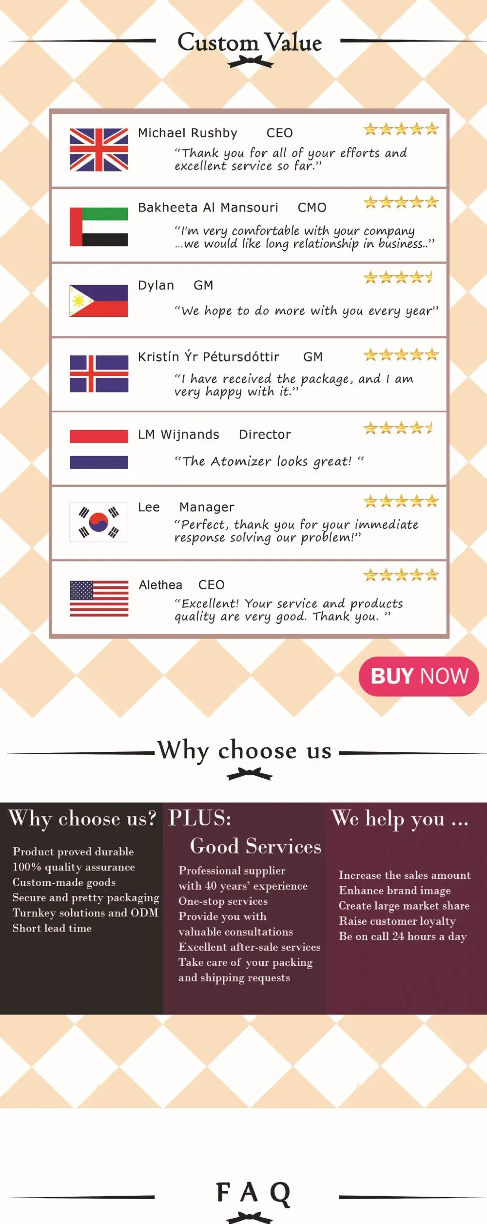 Over the past 40 years, worldwide buyers have recognized us as a specialist of supplying a wide variety of perfume atomizers. As a professional perfume packaging manufacturer, we not only focus on innovative designs, but also make sure that all of our productions are of high quality.
